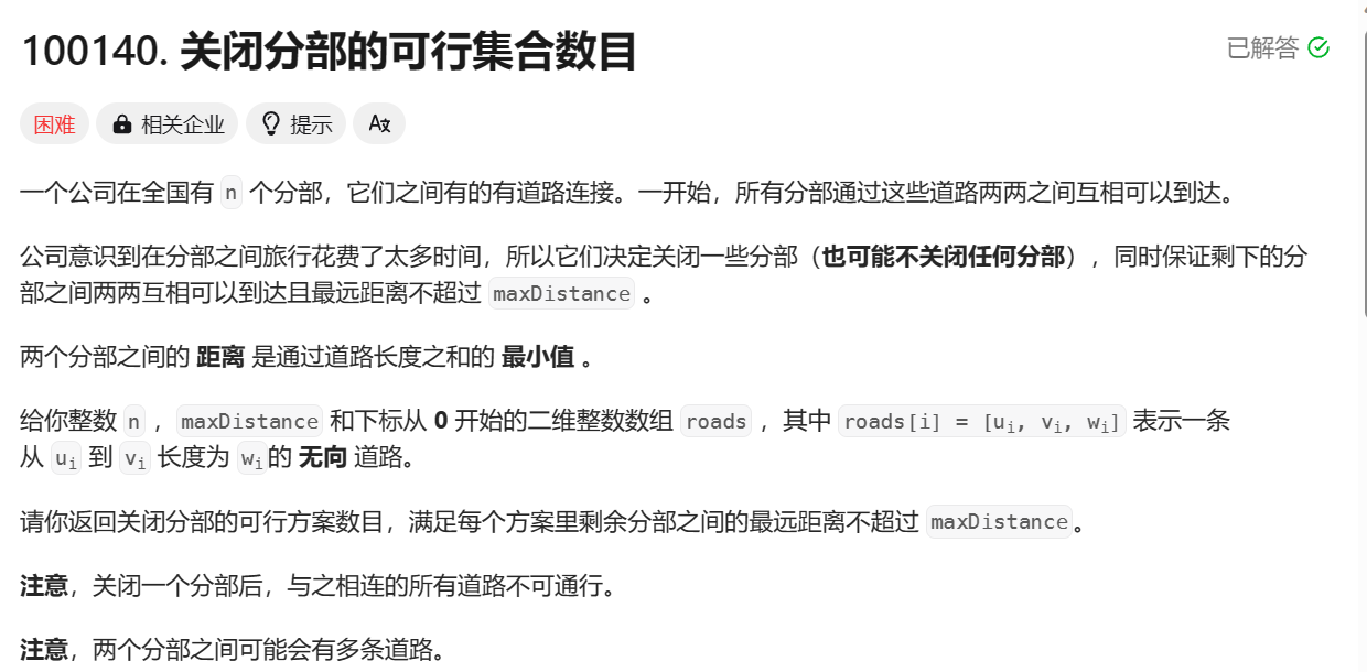class Solution { public: int d[10][10]; int numberOfSets(int n, int maxDistance, vector<vector<int>>& roads) { int res = 0; for(int s = 0; s < (1 << n); s ++ ) { memset(d, 0x3f, sizeof d); for(int j = 0; j < n; j ++ ) d[j][j] = 0; for(auto &it: roads) { int a = it[0], b = it[1], c = it[2]; if((s >> a & 1) && (s >> b & 1)) { d[a][b] = d[b][a] = min(d[a][b], c); } } for(int k = 0; k < n; k ++ ) { for(int i = 0; i < n; i ++ ) { for(int j = 0; j < n; j ++ ) { d[i][j] = min(d[i][j], d[i][k] + d[k][j]); } } } bool flag = 1; for(int i = 0; i < n; i ++ ) { for(int j = 0; j < n; j ++ ) { if((s >> i & 1) && (s >> j & 1)) { if(d[i][j] > maxDistance) { flag = false; break; } } } } if(flag) res ++ ; } return res; } };