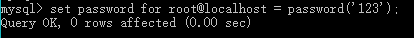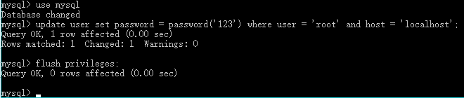 1 use mysql; 2 3 update user set password = password('123') where user = 'root' and host = 'localhost'; 4 5 flush privileges;