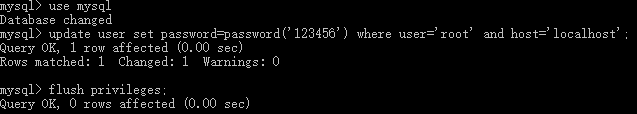 //使用权限数据库 use mysql; //设置新密码 update user set password=password('123456') where user='root' and host='localhost'; //刷新权限 flush privileges;