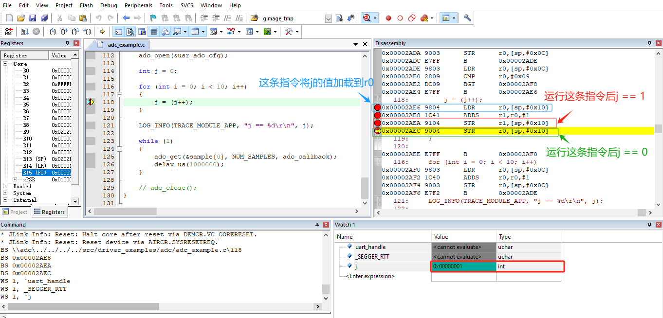 // 将%eax的值写入到j变量,可是%eax保存的是j的初始值即0