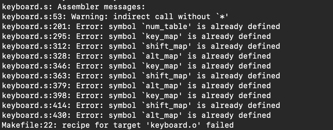 Mac现在用的APFS文件系统默认是不开大小写敏感的,也就是说这个keyboard.S和编译之后文件夹下面的keyboard.s文件在这里是相同的,导致错误。