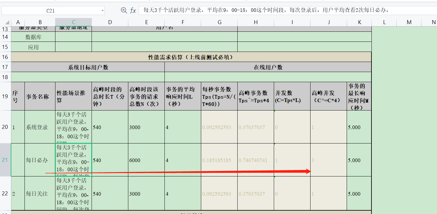 (高峰)并发数(C^)=(高峰)并发数(C^)*4= 3。 (经典公式:并发用户数峰值 C^=C+3×(C的平方根) 、通用公式:C×影响因子(绝大多数场景,一般为3,影响因子可根据实际情况适当调整,如4, 参考:https://wenku.baidu.com/view/bd85ac4db9d528ea80c77992.html?_wkts_=1674465467659&bdQuery=并发与高峰并发公式))