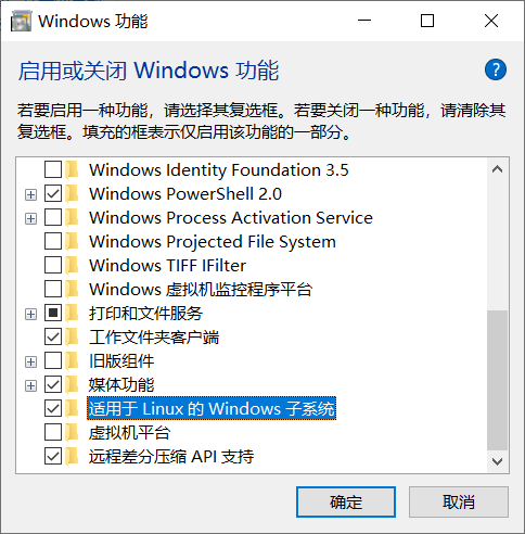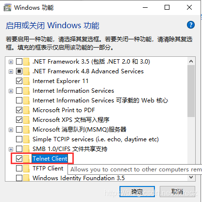 step1:打开控制面板-->程序-->启动或关闭Windows功能,启动'telnet client'和‘适用于Linux的Windows子系统’。如下: