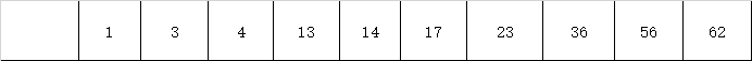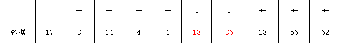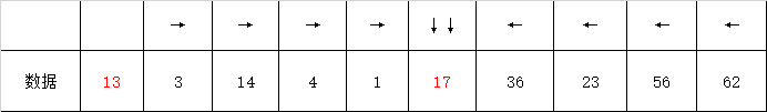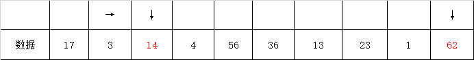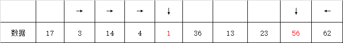 (2)现在进行第二对数据替换,62所在索引向左移动一位,发现值为1,小于17,停止查找并等待替换,4所在索引向右移动一位,值为4小于17,继续向右移动一位,值为56大于17,和之前的1进行替换,第二次替换的结果如下。