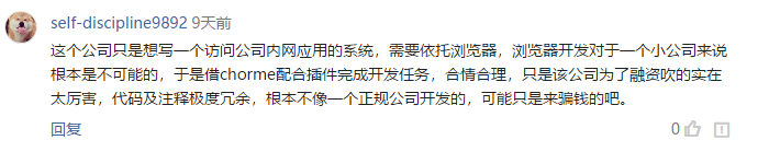 3,这个公司只是想写一个访问公司内网应用的系统,需要依托浏览器,浏览器开发对于一个小公司来说根本是不可能的,于是借chorme配合插件完成开发任务,合情合理,只是公司未来融资吹的实在太厉害,代码及注释实在冗余,根本不像一个正规公司开发的,可能只是来骗钱的吧。