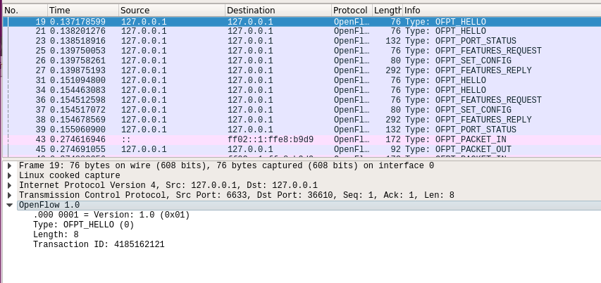 查看抓包结果,分析OpenFlow协议中交换机与控制器的消息交互过程,画出相关交互图或流程图