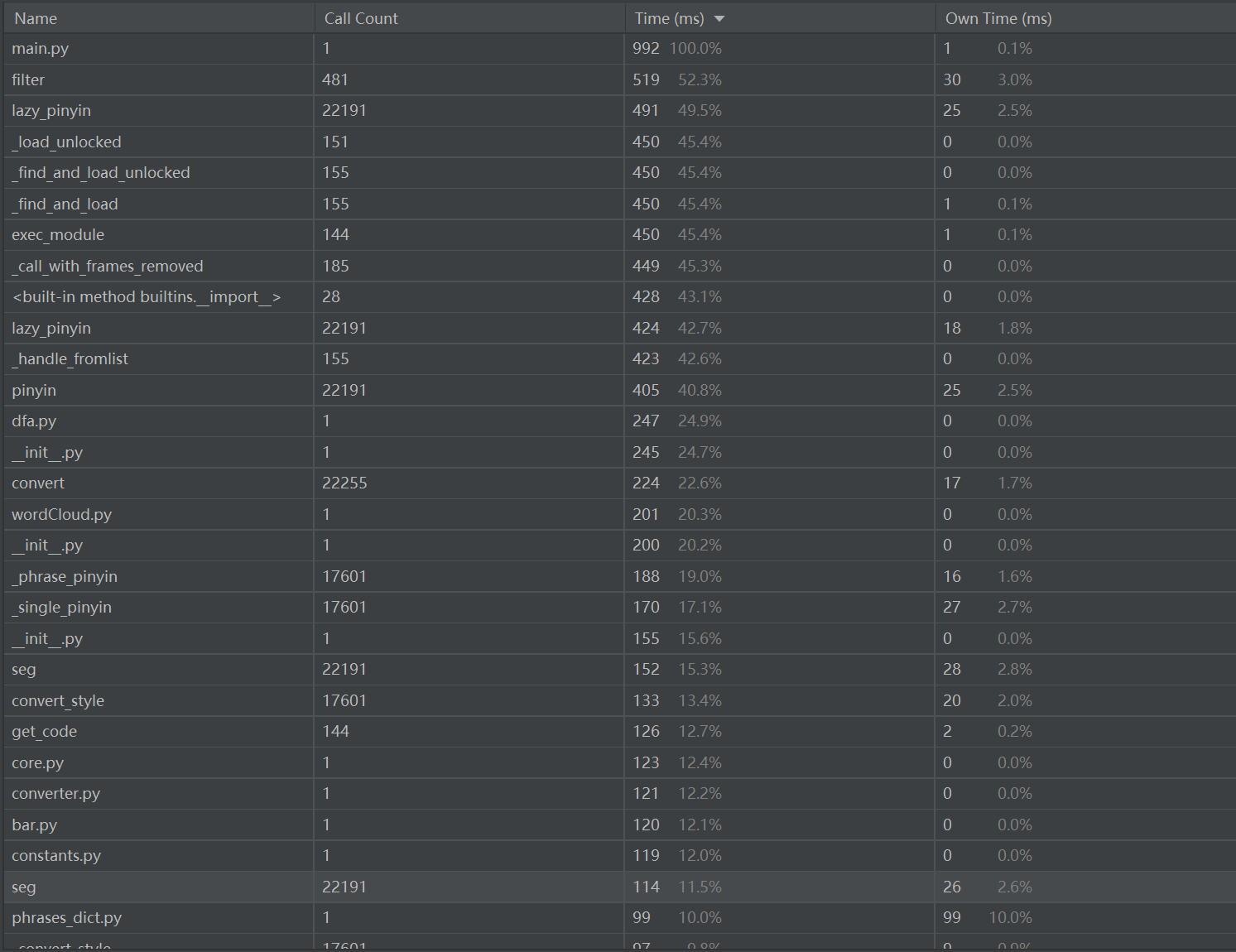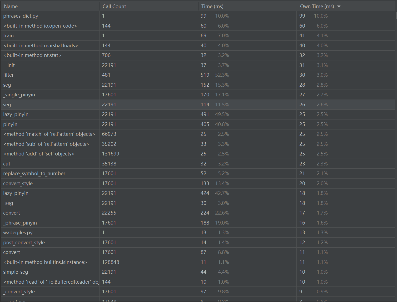 不难发现,由于引用pypinyin包,代码中存在着多次拼音转换,存在多次调用lazy_pinyin,占用时间较大。加之filter函数前期没想清楚,造成很多代码冗余未优化。起初想的是将所有情况按字符建树,这样会造成过滤繁体或者同音字时,需要一个字母一个字母匹配,匹配完成后状态改变,这样会造成循环嵌套过多;后重新将分割的敏感词组进行建树,这样就能快速处理拼音的过滤,但这会导致像“功”这种偏旁部首读音跟原字一样的不会完全匹配,所有最后干脆直接建一个全是英文的树,过滤文本时通过转换拼音再进行处理。