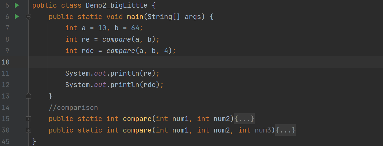 package com.kuang.method; import java.util.Scanner; public class Demo2_bigLittle { public static void main(String[] args) { int a = 10, b = 64; int re = compare(a, b); System.out.println(re); } //comparison public static int compare(int num1, int num2){ //返回的话需要设置初值 int result = 0; if(num1>num2) result = num1; else if(num2>num1) result = num2; else{ System.out.println("num1 == num2"); // return 有终止方法的作用 return 0; } return result; } }