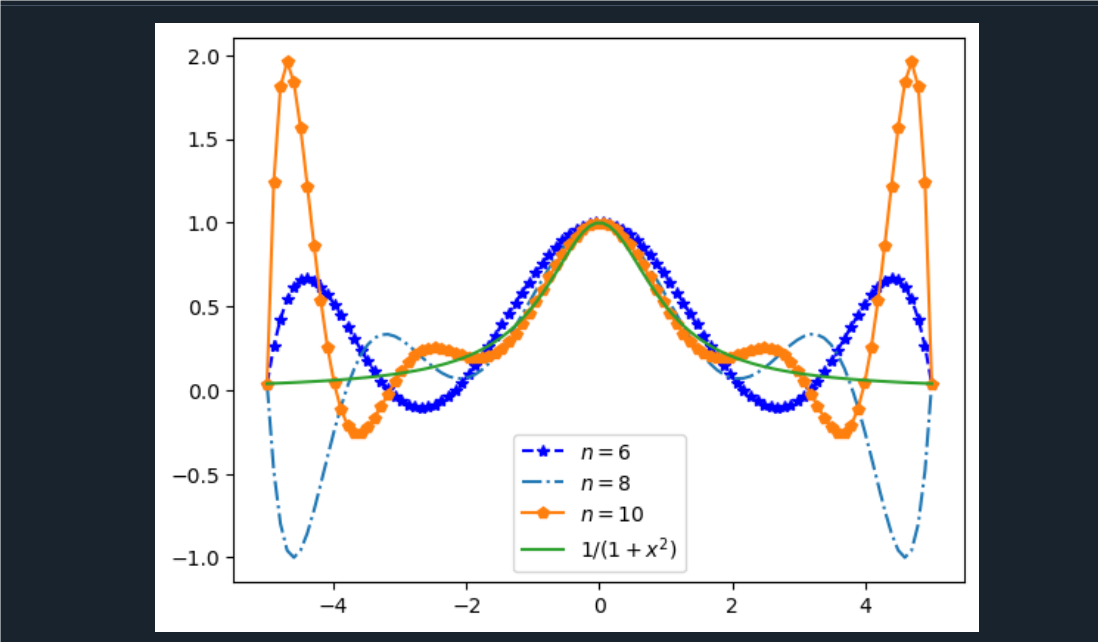 plt.legend(['$n=6$', '$n=8$', '$n=10$','$1/(1+x^2)$'])
