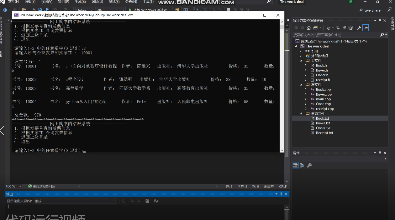 #include"Book.h" #include<iostream> #include<iomanip> #include<fstream> #include<string> using namespace std; Book::Book() { bookID = ""; bookName = ""; author = ""; publish = ""; price = 0; } Book::Book(string bi, string bn, string au, string pu, double pr) { bookID = bi; bookName = bn; author = au; publish = pu; price = pr; } void Book::display() { cout << "书号:" << bookID << "\t"; cout << " 书名: " << bookName << "\t"; cout << " 作者: " << author << "\t"; cout << " 出版社: " << publish << "\t"; cout << " 价格: " << price << "\t"; } #include<iostream> #include<string> using namespace std; class Book { public: Book(); Book(string bi, string bh, string au, string pu, double pt);//构造函数 void display();//显示函数 private: string bookID;//编号 string bookName;//书名 string author;//作者 string publish;//出版社 double price;//价格 }; #include "Buyer.h" #include <iostream> #include <iomanip> #include <fstream> #include <string> using namespace std; Buyer::Buyer() { buyerID = ""; name = ""; address = ""; } Buyer::Buyer(string id, string na, string ad) { name = na; buyerID = id; address = ad; } int getLine() { ifstream in("Buyer.txt"); string line; int n = 0; while (getline(in, line)) { n++; } in.close(); return n; } void Buyer::display() { cout << " 买家信息: "; cout << "ID :" << buyerID << "\t"; cout << " 姓名: " << name << "\t"; cout << " 地址: " << address << "\n"; } void People::display() { Buyer::display(); cout << " 该买家是普通人,无折扣率。" << "\n"; } void Member::display() { Buyer::display(); cout << " 该买家是会员,折扣率为 " << discount_member * 10 << " 折! \n"; } void Vip::display() { Buyer::display(); cout << " 该买家是贵宾,折扣率为 " << discount_vip * 10 << "折! \n"; } #pragma once #include <string> using namespace std; // 购书者类 class Buyer { public: Buyer(); Buyer(string id, string na, string ad); // 构造函数 virtual void display(); // 显示函数(虚函数) protected: string buyerID; // 买家ID string name; // 姓名 string address; // 地址 }; // 普通人类 class People : public Buyer { public: People(string id, string na, string ad) :Buyer(id, na, ad) { } void display(); }; // 会员类 class Member : public Buyer { public: Member(string id, string na, string ad, double dc) :Buyer(id, na, ad) { discount_member = dc; } void display(); private: double discount_member; // 折扣率 }; // 贵宾类 class Vip : public Buyer { public: Vip(string id, string na, string ad, double dc) :Buyer(id, na, ad) { discount_vip = dc; } void display(); private: double discount_vip; // 折扣率 }; #include <iostream> #include "Receipt.h" using namespace std; // 函数原型 void main_menu(); // 主菜单 void add_menu(); // 添加发票操作完成后显示的菜单 void delete_menu(); // 删除发票操作完成后显示的菜单 void select_menu(); // 查找发票操作完成后显示的菜单 void print_menu(); // 显示所有发票信息操作完成后显示的菜单 int main() { main_menu(); return 0; } // 主菜单 void main_menu() { Receipt re; cout << "---------------- 网上购书的结账系统----------------" << endl; cout << " 1. 发票信息录入 " << endl; cout << " 2. 发票信息删除 " << endl; cout << " 3. 根据发票号查询发票信息 " << endl; cout << " 4. 根据买家ID 查询发票信息 " << endl; cout << " 5. 打印所有发票信息 " << endl; cout << " 0. 退出 " << endl; cout << "----------------------------------------------------------" << endl; cout << " 请输入1-4 中的任意数字(0 退出):"; int index = -1; cin >> index; switch (index) { case 0: break; case 1: { re.addReceipt(); add_menu(); } case 2: { re.deleteReceipt(); delete_menu(); } case 3: { re.selectReceiptByRI(); select_menu(); } case 4: { re.selectReceiptByBI(); select_menu(); } case 5: { re.print(); print_menu(); } } } // 添加发票操作完成后显示的菜单 void add_menu() { Receipt re; cout << "---------------- 网上购书的结账系统----------------" << endl; cout << " 1. 发票信息再录入 " << endl; cout << " 2. 返回上级目录 " << endl; cout << " 0. 退出 " << endl; cout << "----------------------------------------------------------" << endl; cout << " 请输入1-2 中的任意数字(0 退出):"; int index = -1; cin >> index; switch (index) { case 0: break; case 1: { re.addReceipt(); add_menu(); } case 2: main_menu(); } } // 删除发票操作完成后显示的菜单 void delete_menu() { Receipt re; cout << "---------------- 网上购书的结账系统----------------" << endl; cout << " 1. 发票信息再删除 " << endl; cout << " 2. 返回上级目录 " << endl; cout << " 0. 退出 " << endl; cout << "----------------------------------------------------------" << endl; cout << " 请输入1-2 中的任意数字(0 退出):"; int index = -1; cin >> index; switch (index) { case 0: break; case 1: { re.deleteReceipt(); delete_menu(); } case 2: main_menu(); } } //根据订单号查找发票操作完成后显示的菜单 void select_menu() { Receipt re; cout << "---------------- 网上购书的结账系统----------------" << endl; cout << " 1. 根据发票号查询发票信息 " << endl; cout << " 2. 根据买家ID 查询发票信息 " << endl; cout << " 3. 返回上级目录 " << endl; cout << " 0. 退出 " << endl; cout << "----------------------------------------------------------" << endl; cout << " 请输入1-2 中的任意数字(0 退出):"; int index = -1; cin >> index; switch (index) { case 0: break; case 1: { re.selectReceiptByRI(); select_menu(); } case 2: { re.selectReceiptByBI(); select_menu(); } case 4: main_menu(); } } // 显示所有发票信息操作完成后显示的菜单 void print_menu() { Receipt re; cout << "---------------- 网上购书的结账系统----------------" << endl; cout << " 1. 返回上级目录 " << endl; cout << " 0. 退出 " << endl; cout << "----------------------------------------------------------" << endl; cout << " 请输入1-2 中的任