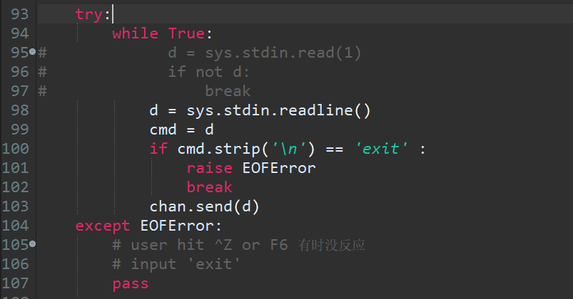 1 import paramiko 2 3 # 密钥路径 4 private_key_path = '/root/.ssh/id_rsa' 5 # 生成密钥对象 6 private_key = paramiko.RSAKey.from_private_key_file(private_key_path) 7 transport = paramiko.Transport(HOST, PORT) 8 transport.connect(username=USERNAME, pkey=private_key) 9 sftp = paramiko.SFTPClient.from_transport(transport) 10 # 上传文件 11 sftp.put('cmds.txt', 'cmds.txt') 12 # 下载文件 13 sftp.get('zzz.txt', 'zzz.txt') 14 # 关闭连接 15 transport.close()