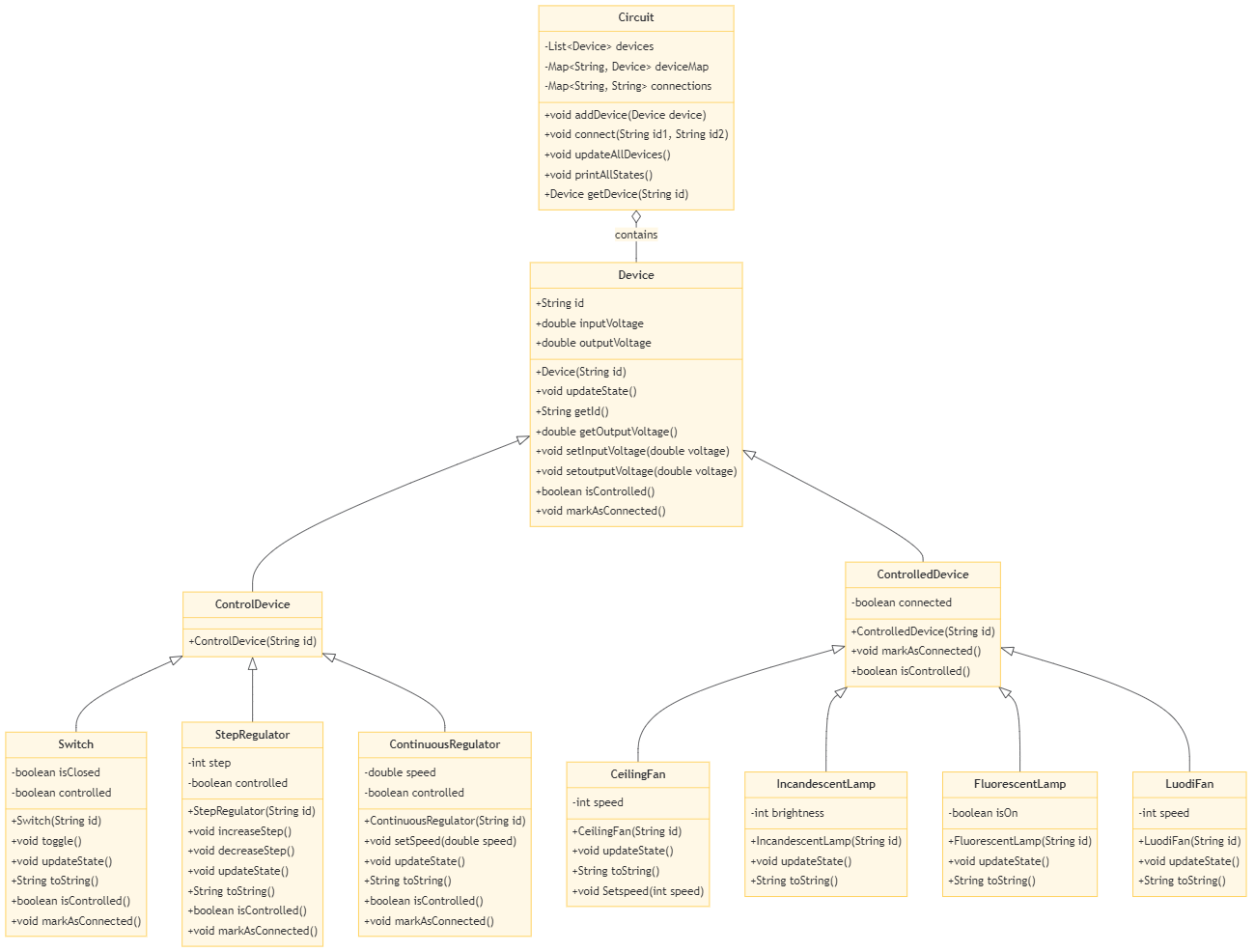 Device 类是所有设备的基类,它定义了所有设备共有的属性和方法。每个设备都有一个唯一的ID、输入电压和输出电压。updateState 方法是一个抽象方法,由子类实现以反映设备状态的变化。