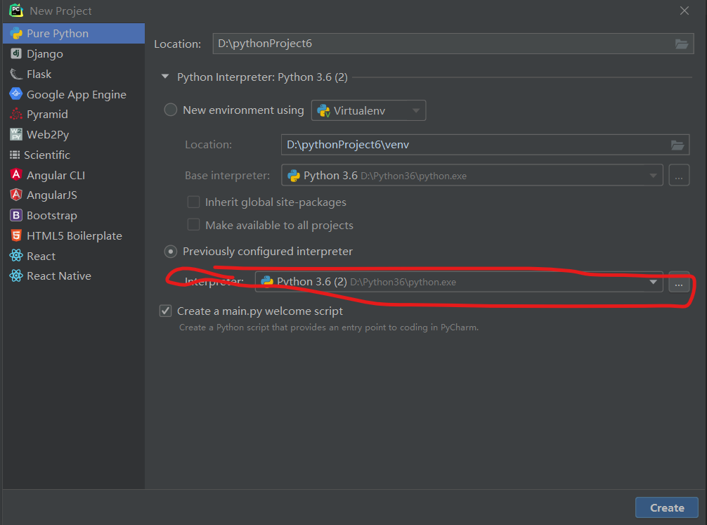 5.也可在pycham里添加,可在创建新项目直接指定你需要的版本解释器。