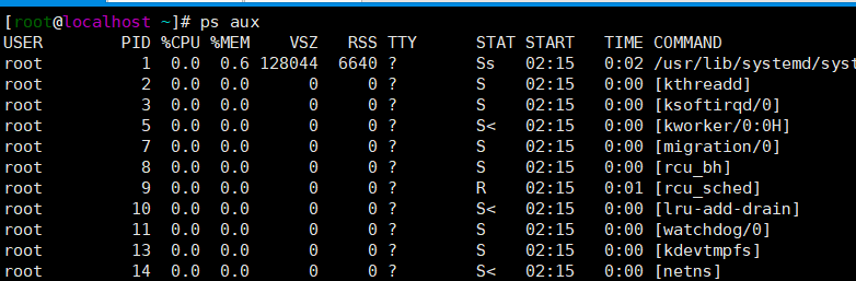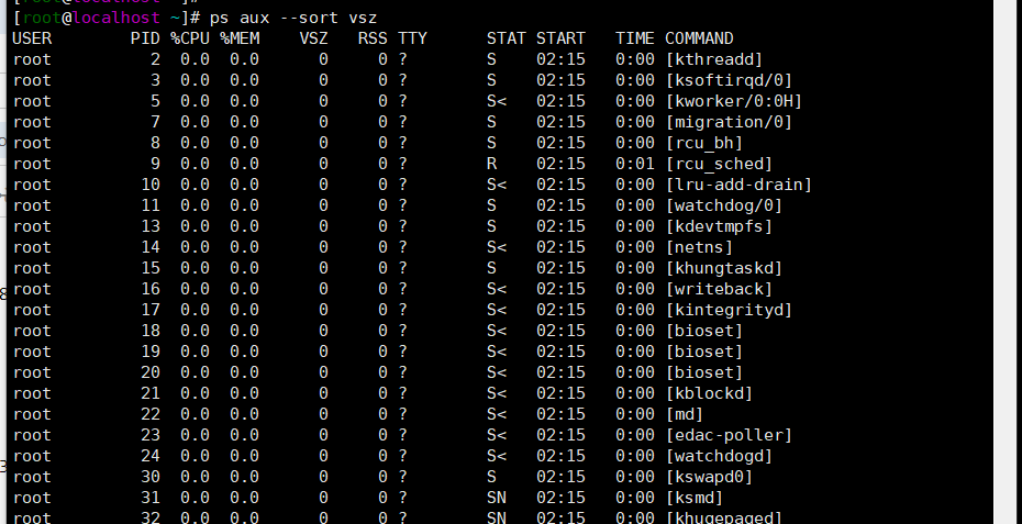 root 2 0.0 0.0 0 0 ? S 02:15 0:00 [kthreadd]