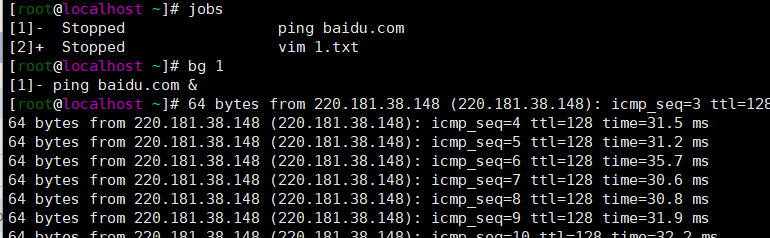 bg:把后台暂停的进程运行起来,后面加上暂停的数字,即可运行相应的进程(默认为最后一个)