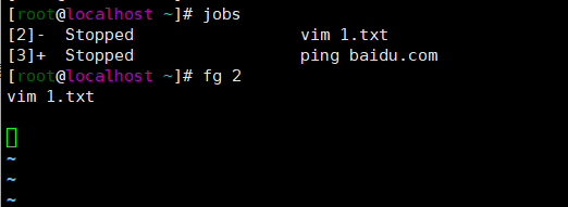 fg:把后台暂停的进程,调到前台并运行,后面加上暂停的数字,即可将相应的进程调动到前台运行(默认为最后一个)
