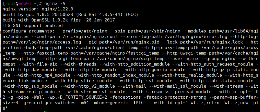 configure arguments: --prefix=/etc/nginx --sbin-path=/usr/sbin/nginx --modules-path=/usr/lib64/nginx/modules --conf-path=/etc/nginx/nginx.conf --error-log-path=/var/log/nginx/error.log --http-log-path=/var/log/nginx/access.log --pid-path=/var/run/nginx.pid --lock-path=/var/run/nginx.lock --http-client-body-temp-path=/var/cache/nginx/client_temp --http-proxy-temp-path=/var/cache/nginx/proxy_temp --http-fastcgi-temp-path=/var/cache/nginx/fastcgi_temp --http-uwsgi-temp-path=/var/cache/nginx/uwsgi_temp --http-scgi-temp-path=/var/cache/nginx/scgi_temp --user=nginx --group=nginx --with-compat --with-file-aio --with-threads --with-http_addition_module --with-http_auth_request_module --with-http_dav_module --with-http_flv_module --with-http_gunzip_module --with-http_gzip_static_module --with-http_mp4_module --with-http_random_index_module --with-http_realip_module --with-http_secure_link_module --with-http_slice_module --with-http_ssl_module --with-http_stub_status_module --with-http_sub_module --with-http_v2_module --with-mail --with-mail_ssl_module --with-stream --with-stream_realip_module --with-stream_ssl_module --with-stream_ssl_preread_module --with-cc-opt='-O2 -g -pipe -Wall -Wp,-D_FORTIFY_SOURCE=2 -fexceptions -fstack-protector-strong --param=ssp-buffer-size=4 -grecord-gcc-switches -m64 -mtune=generic -fPIC' --with-ld-opt='-Wl,-z,relro -Wl,-z,now -pie'