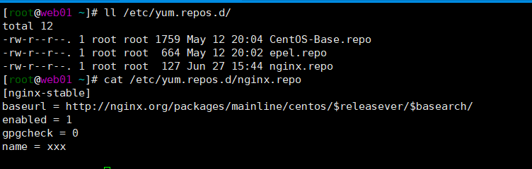 [root@m01 ~]# ansible web_group -m yum_repository -a 'file=nginx name=nginx-stable description="xxx" baseurl=http://nginx.org/packages/mainline/centos/$releasever/$basearch/ gpgcheck=false enabled=true '