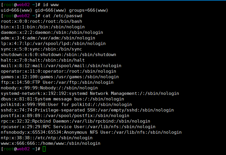 [root@m01 ~]# ansible web_group -m user -a 'name=www uid=666 group=666 shell=/sbin/nologin create_home=no'