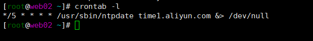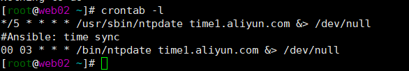 [root@m01 ~]# ansible web_group -m cron -a 'name="time sync" minute=00 hour=03 job="/bin/ntpdate time1.aliyun.com &> /dev/null"'