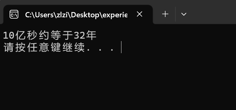 #include <stdio.h> #include <stdlib.h> #include <math.h> int main() { double year; year=1e+9; year=year/31536000+0.5; printf("10亿秒约等于%d年\n",(int)year); system("pause"); return 0; }