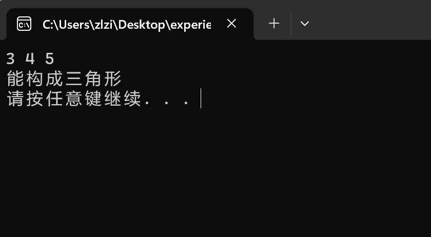 #include<stdio.h> #include<stdlib.h> int main() { float a, b, c; //输入三边边长 scanf("%f%f%f", &a, &b, &c); //判断能否构成三角形 if(((a+b)>c)&&((b+c)>a)&&((a+c)>b)) printf("能构成三角形\n"); else printf("不能构成三角形\n"); system("pause"); return 0; }