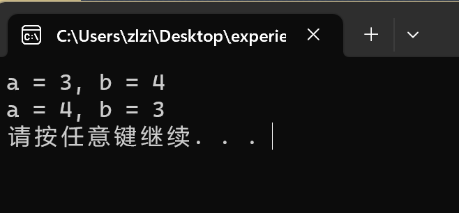#include<stdio.h> #include<stdlib.h> int main() { int a, b, t; a = 3; b = 4; printf("a = %d, b = %d\n", a, b); t = a; a = b; b = t; printf("a = %d, b = %d\n", a, b); system("pause"); return 0; }