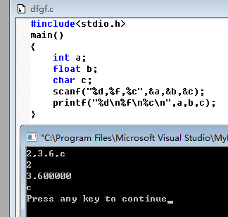 7. 编写程序,使用scanf()函数接收整型,实型,字符型的变量,并分行依次输出。