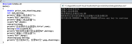 printf("您付款%lf元,找零%lf元",pay,zhaoling);