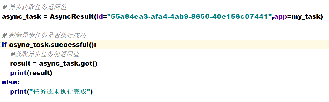 from celery.result import AsyncResult from s1 import my_task # 异步获取任务返回值 async_task = AsyncResult(id="31ec65e8-3995-4ee1-b3a8-1528400afd5a",app=my_task) # 判断异步任务是否执行成功 if async_task.successful(): #获取异步任务的返回值 result = async_task.get() print(result) else: print("任务还未执行完成")