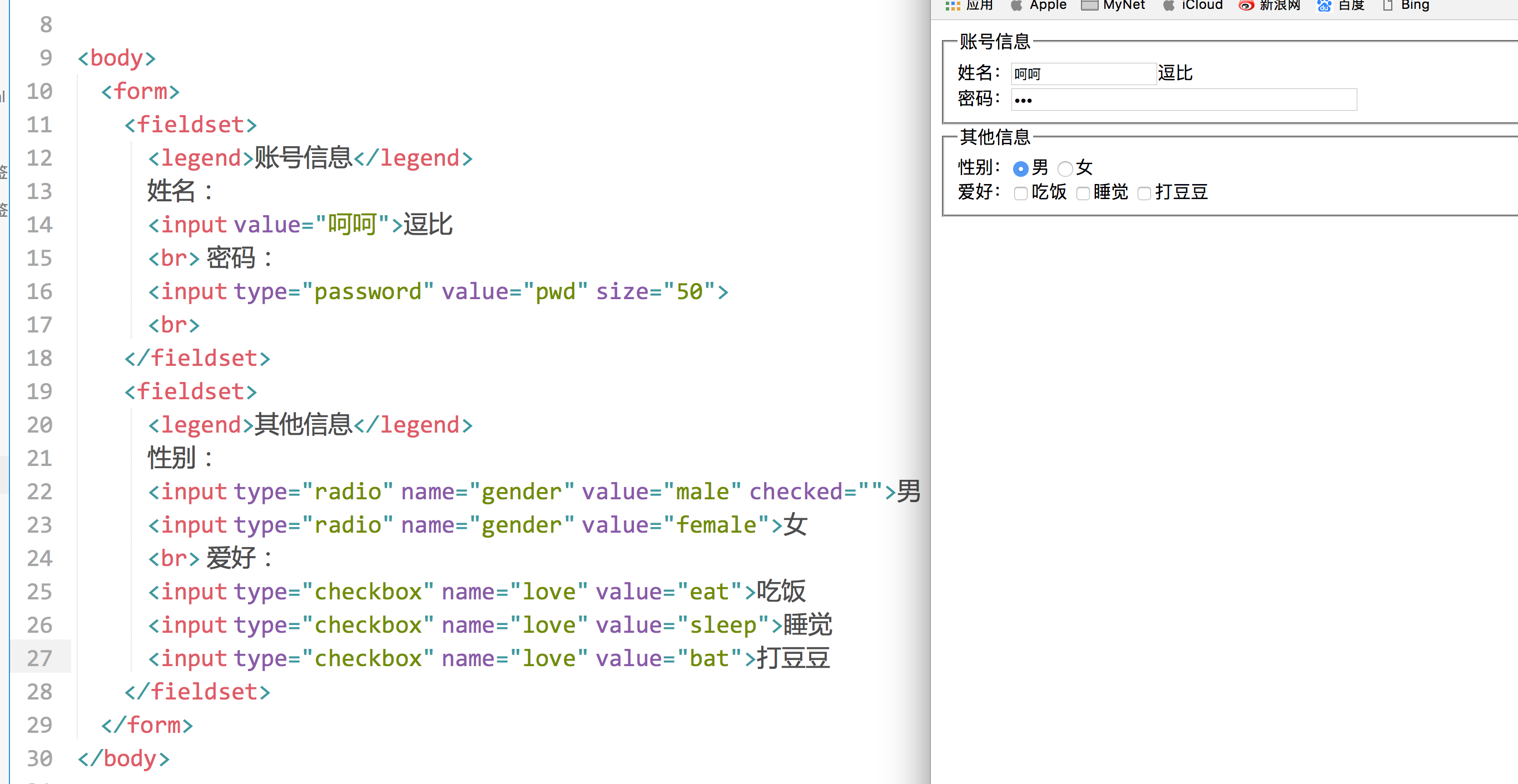radio 单选框,单选按钮,名字相同的按钮作为一组进行单选(单选按钮,天生是不能互斥的,如果想互斥,必须要有相同的name属性。name就是“名字”。