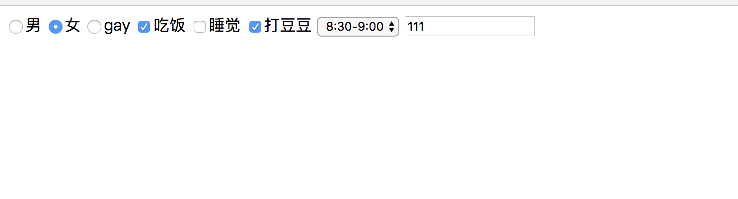 <!DOCTYPE html> <html lang="en"> <head> <meta charset="UTF-8"> <title></title> </head> <body> <form action=""> <input type="radio" name="sex" value="112" />男 <!-- 设置cheked属性表示选中当前选项 --> <input type="radio" name="sex" value="11" checked="" />女 <input type="radio" name="sex" value="11" />gay <input type="checkbox" value="a" checked=""/>吃饭 <input type="checkbox" value="b" />睡觉 <input type="checkbox" value="c" checked=""/>打豆豆 <!-- 下拉列表 option标签内设置selected属性 表示选中当前 --> <select name="timespan" id="timespan" class="Wdate" > <option value="1">8:00-8:30</option> <option value="2" selected="">8:30-9:00</option> <option value="3">9:00-9:30</option> </select> <input type="text" name="" id="" value="111" /> </form> </body> </html>