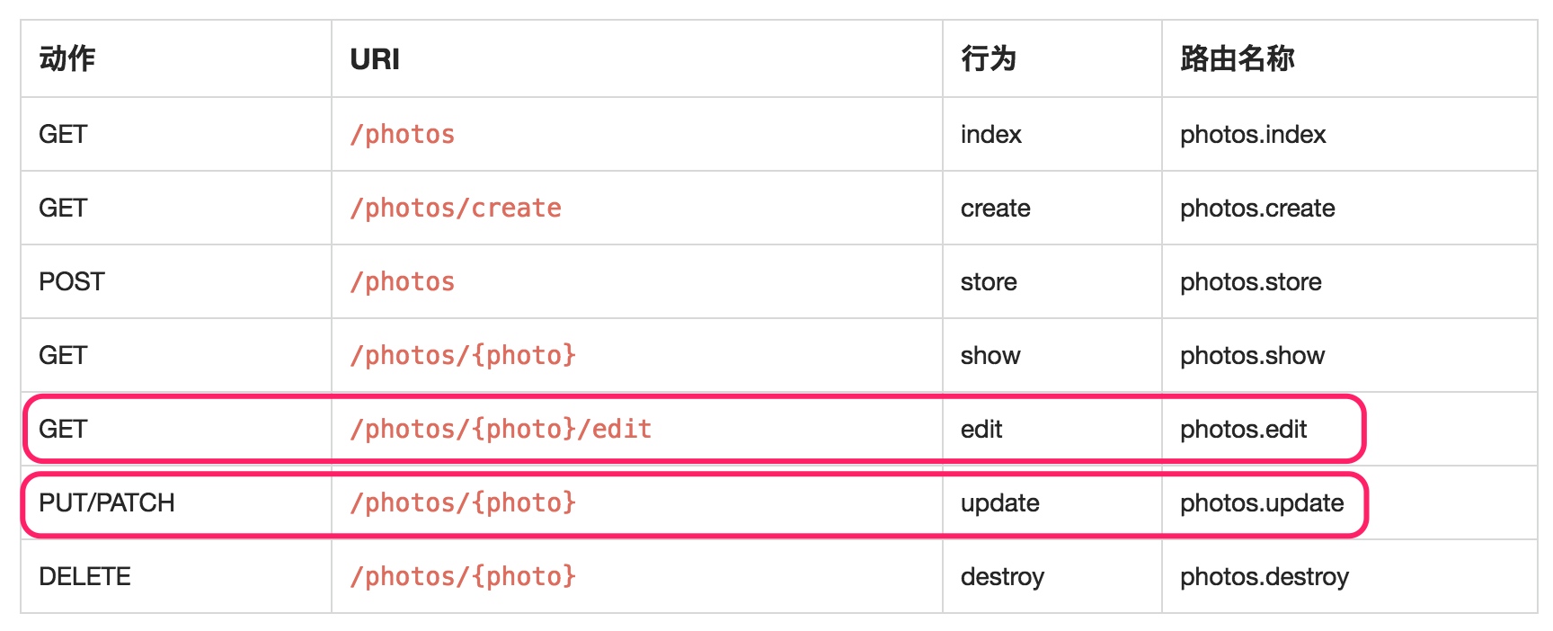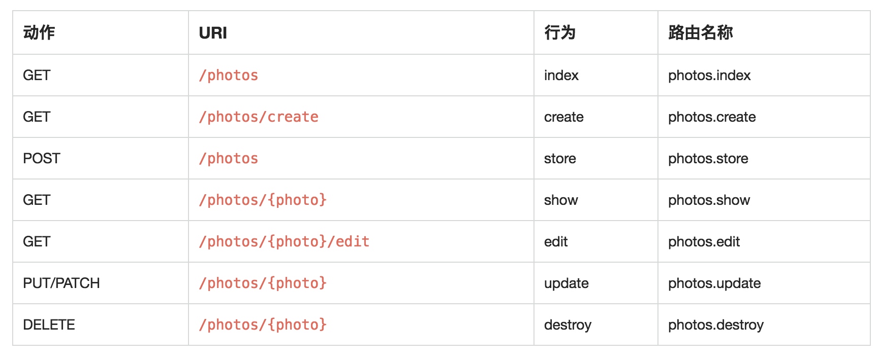 左边是 HTTP 方法,中间是 URL 路径,右边是 控制器中对应的函数,只要某个请求符合这七行中某一行的要求,那么这条请求就会触发第三列的 function。这是 Laravel 对于 RESTful 的规范,它不仅仅帮我们省去了几行路由配置代码,更是如何合理规划 URL 的指路明灯,相信你会从中学到很多。