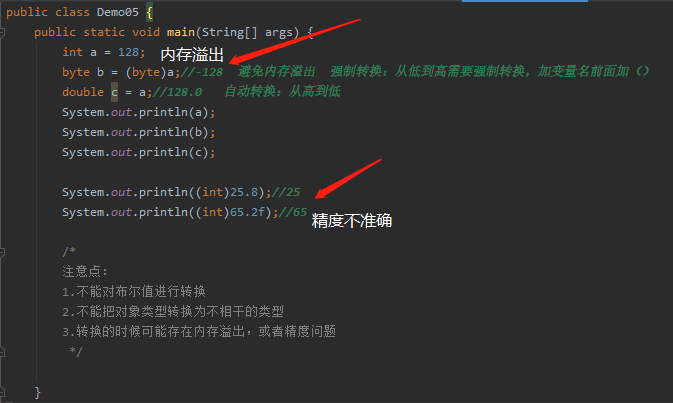 从高到底:需要强制转换。强制转换时,在变量前面加()输入相应的类型