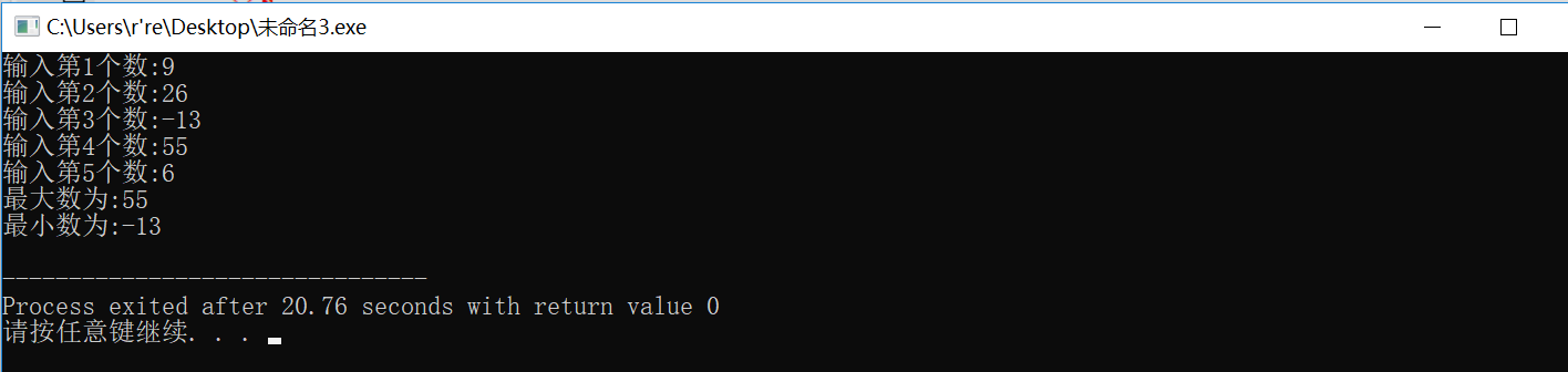 #include<stdio.h> int main(){ int number,max,min,n; n=1; printf("输入第%d个数:",n); scanf("%d",&number); max=number; min=number; while(n<5){ n++; printf("输入第%d个数:",n); scanf("%d",&number); if(number>max) max=number; else if(number<min) min=number; } printf("最大数为:%d\n",max); printf("最小数为:%d\n",min); return 0; }