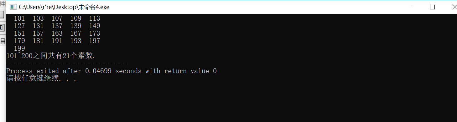 #include<stdio.h> #include<math.h> int main(){ int n,m,i,k=0; for(n=101;n<=200;n++){ m=sqrt(n); for(i=2;i<=m;i++){ if(n%i==0)break; } if(i>m) printf("%5d",n); else continue; k++; if(k%5==0) printf("\n"); } printf("\n101~200之间共有%d个素数.",k); return 0; }