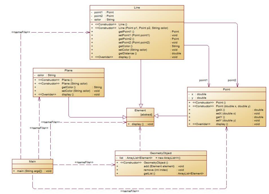 import java.util.ArrayList; import java.util.Scanner; public class Main { public static void main(String[] args) { // TODO 自动生成的方法存根 Scanner input = new Scanner(System.in); int choice = input.nextInt(); double x; double y; double z; double w; int number; String color; GeometryObject g = new GeometryObject(); while(choice != 0) { switch(choice) { case 1:{ x=input.nextDouble(); y=input.nextDouble(); Point p = new Point(x,y); g.add(p); } break; case 2:{ x=input.nextDouble(); y=input.nextDouble(); Point p1 = new Point(x,y); z=input.nextDouble(); w=input.nextDouble(); Point p2 = new Point(z,w); color = input.next(); Line L = new Line(p1,p2,color); g.add(L); } break; case 3:{ color = input.next(); Plane p = new Plane(color); g.add(p); } break; case 4:{ number = input.nextInt(); if(g.getList().size()>=number) g.remove(number-1); } } choice = input.nextInt(); } ArrayList<Element> list = g.getList(); for(int i=0;i<list.size();i++) { list.get(i).display(); } } }