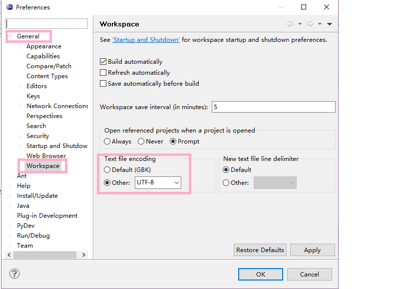 2.选择“General-Workspace”将“Test file encoding”设置为UTF-8(对应中文:“常规-工作空间”将“文本文件编码”设置为UTF-8)