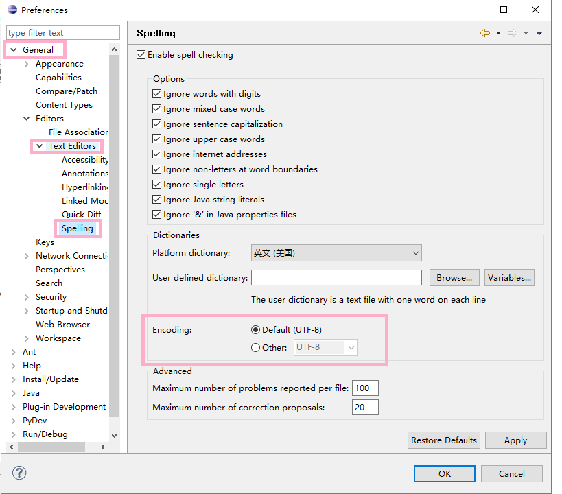 3.选择“General-Test Editors-Spelling”,将Encoding设置为UTF-8(对应中文:“常规-文本编辑器-拼写”将“编码(C)”设置为UTF-8)