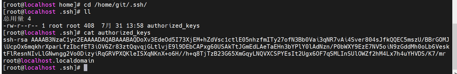 收集所有需要登录的用户的公钥,公钥位于id_rsa.pub文件中,把我们的公钥导入到/home/git/.ssh/authorized_keys文件里,一行一个