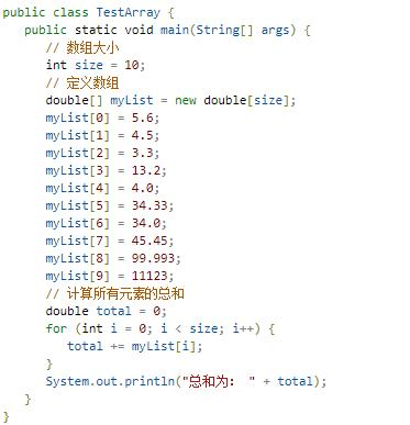 下面的语句首先声明一个数组变量myList,然后创建一个包含10个double类型元素的数组,并将其引用赋值给myList变量。