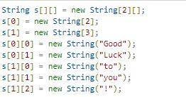 s[0]=new String[2]和s[1]=new String[3]为最高维度分配引用空间,即限制可为最高维度保存的数据的最长长度,然后为每个数组元素分配空间,例如s0=new String(“good”)。