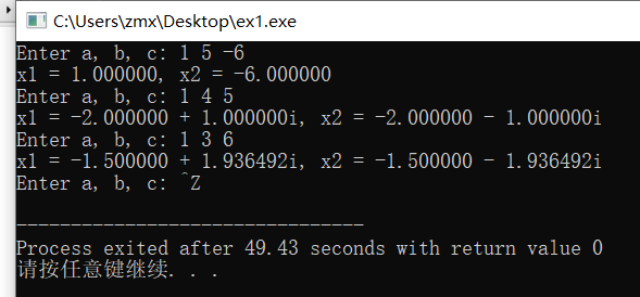 printf("x1 = %f + %fi, x2 = %f - %fi\n", real, imag, real, imag);