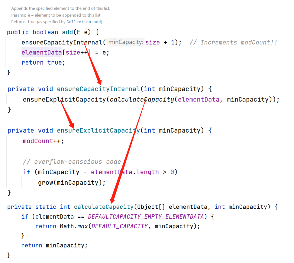 每次添加元素到集合中时都会先确认下集合容量大小。然后将 size 自增 1。ensureCapacityInternal 函数中判断如果 elementData = DEFAULTCAPACITY_EMPTY_ELEMENTDATA 就取 DEFAULT_CAPACITY 和 minCapacity 的最大值也就是 10。这就是 EMPTY_ELEMENTDATA 与 DEFAULTCAPACITY_EMPTY_ELEMENTDATA 的区别所在。同时也验证了上面的说法:使用无惨构造函数时是在第一次添加元素时初始化容量为 10 的。ensureExplicitCapacity 中对 modCount 自增 1,记录操作次数,然后如果 minCapacity 大于 elementData 的长度,则对集合进行扩容。 -