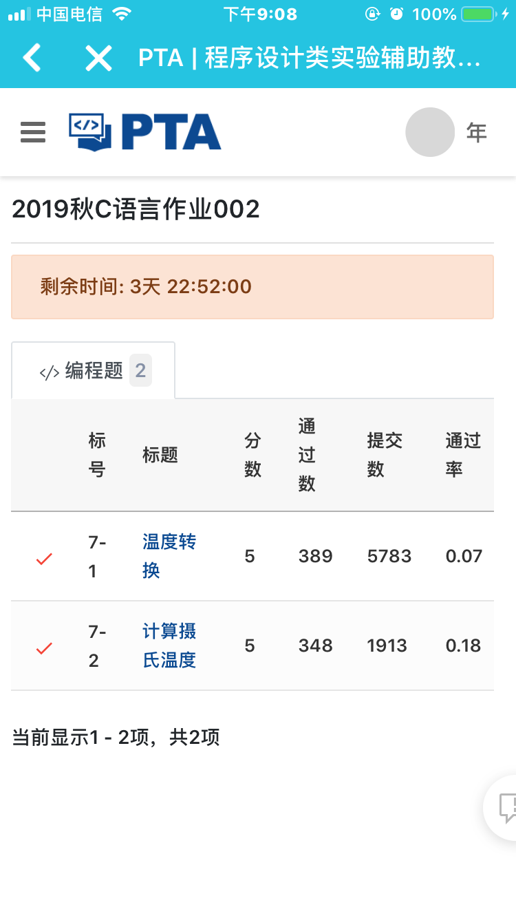 2,2请完成PTA作业:2019秋C语言作业002。在博客作业中贴出完成图片,图片要求存在自己的名字标识。