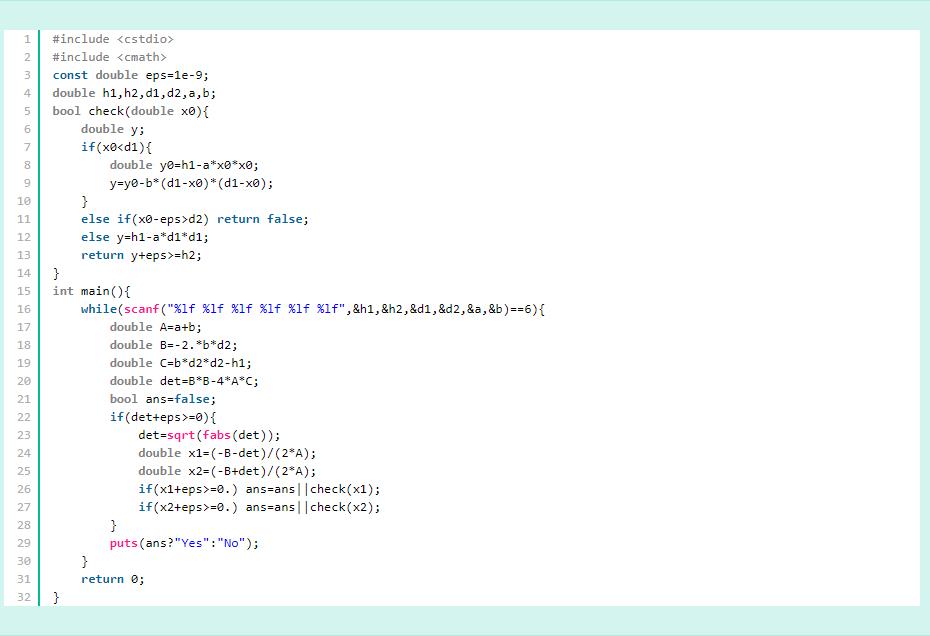 - 定义了浮点型变量eps h1 h2 d1 d2 a b,并给eps赋值了1e-9