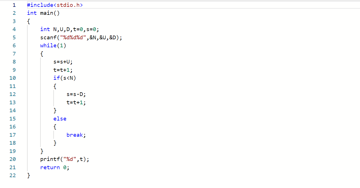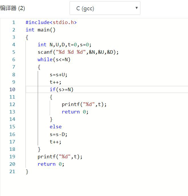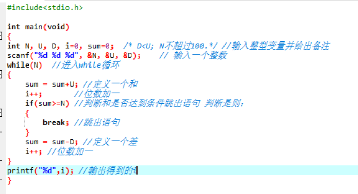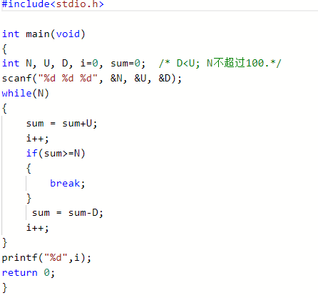 - 数据处理:用while语句进入循环,先加U值再减D值,直到符合条件,跳出循环,输出i值。