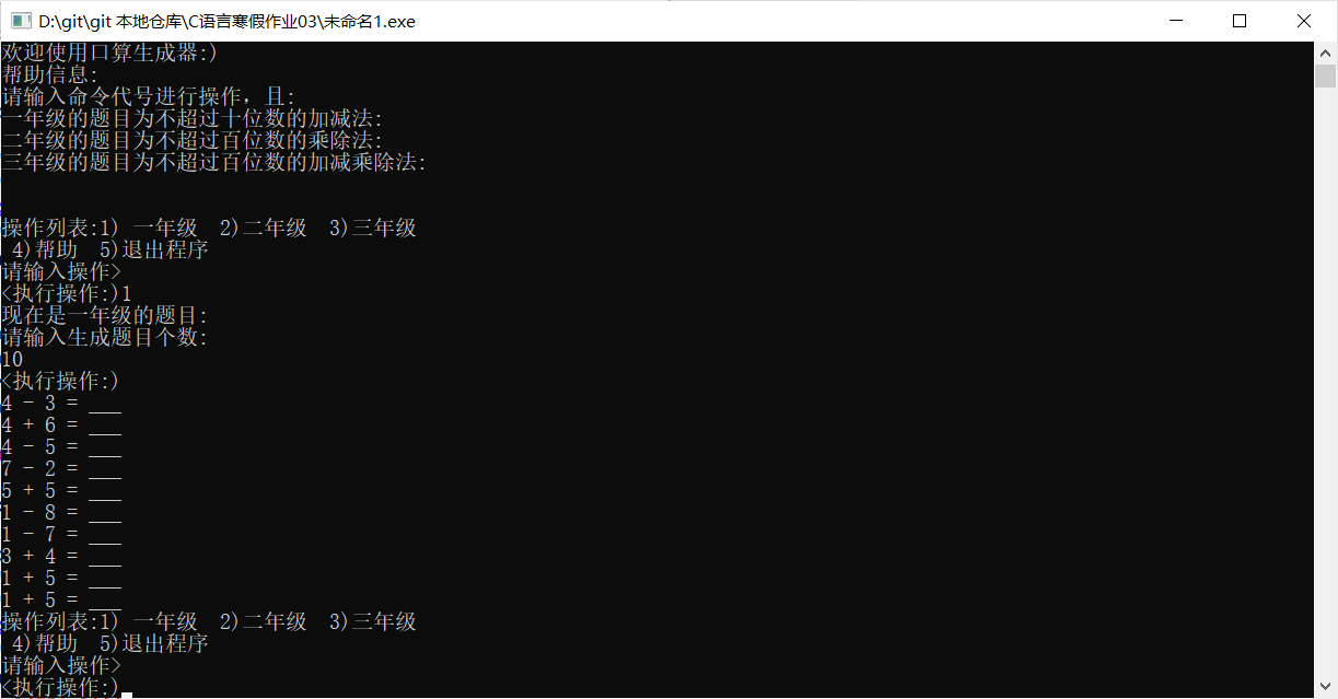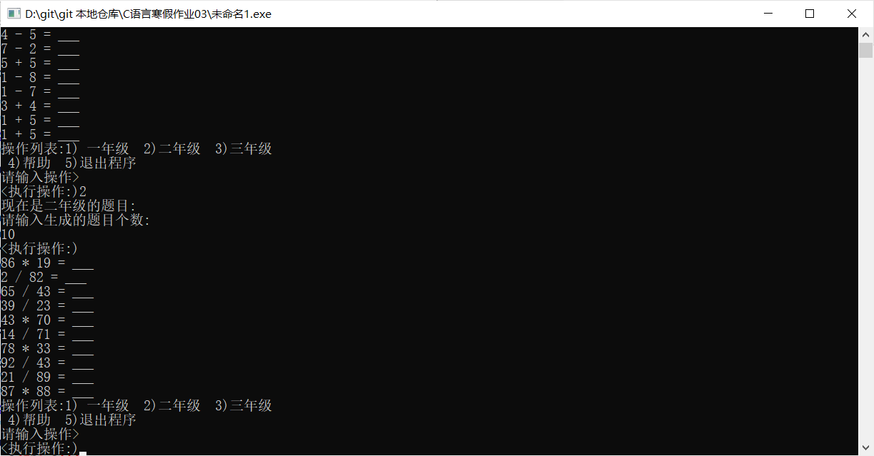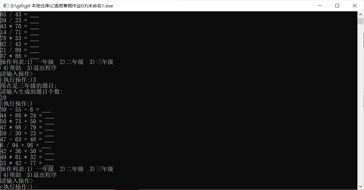 printf("三年级的题目为不超过百位数的加减乘除法:\n");