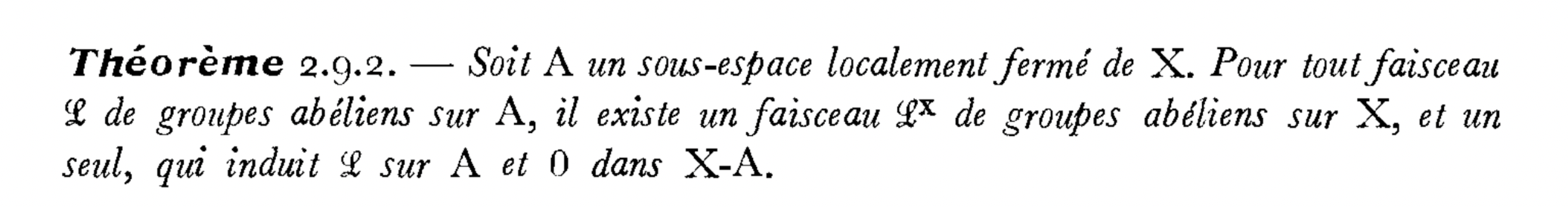 X中的A是局部紧子空间等价于,对于任意X上abel群中的sheaf L,存在另一个sheaf,其在A上的限制同构于L|A,在X\A上等于0。