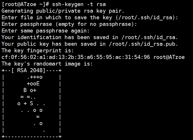 [root@ATzoe ~]# ssh-keygen -t rsa #rsa是一种密钥加密算法